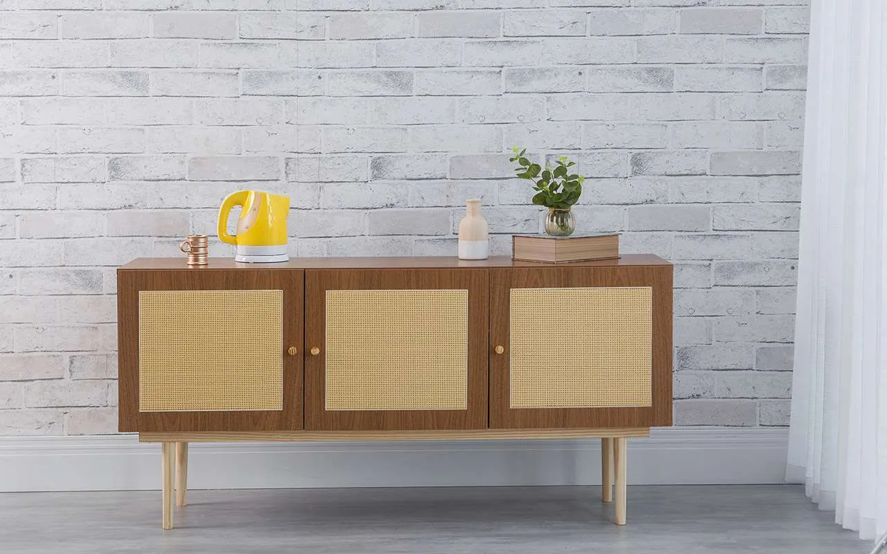 Outra coisa que precisamos te contar é que as portas desse buffet 2 portas com palhinha são realmente de ratan. Ratan de verdade tá? Não é nenhum tipo de impressão. São duas portas de ratan natural.