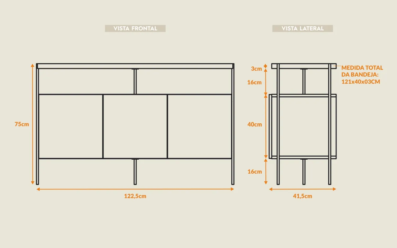 Construído para impressionar, o Armário Buffet Tray possui uma estrutura robusta feita inteiramente de MDF de 15mm. O acabamento melamínico de alta qualidade proporciona uma superfície elegante e durável, enquanto as bordas revestidas acrescentam um toque de requinte.