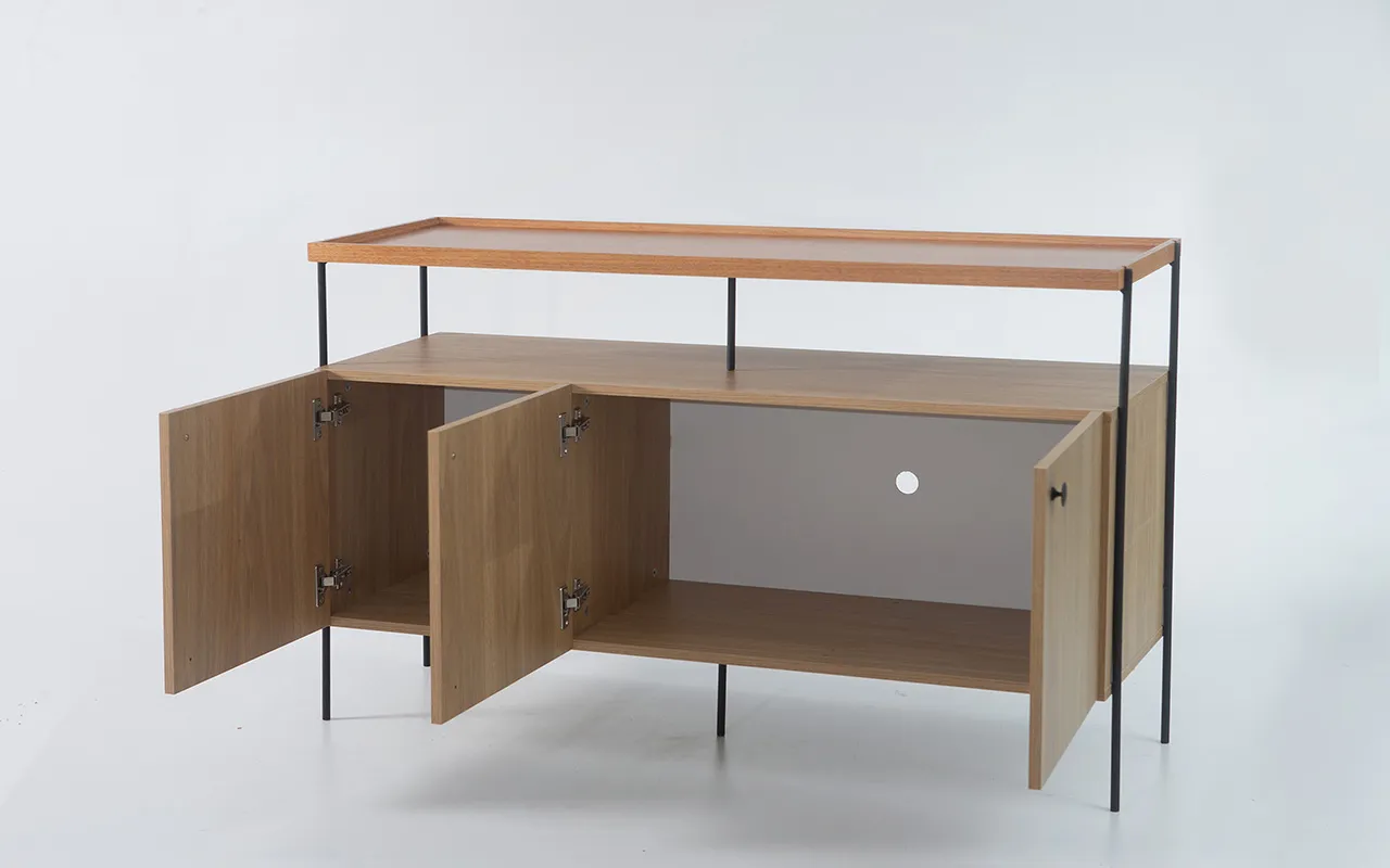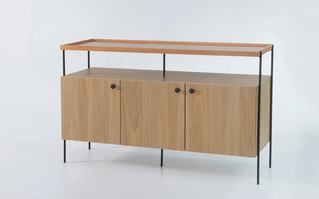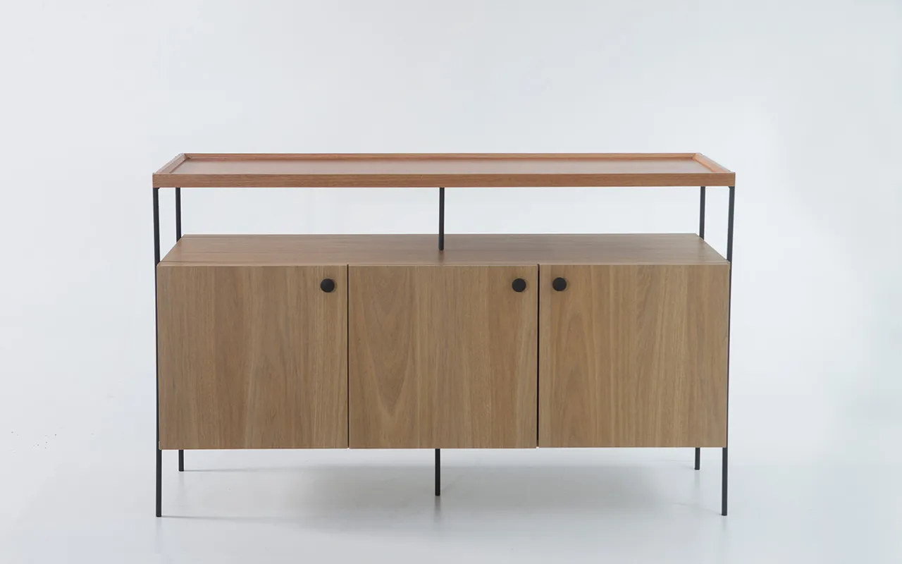 Este aparador é equipado com três portas principais, permitindo um armazenamento organizado e discreto. Mas a verdadeira inovação está no tampo estendido, que oferece um espaço adicional para itens decorativos ou práticos. A característica principal é a bandeja de madeira maciça de tauari, que não só adiciona um toque de beleza natural, mas também é envernizada para proteção contra desgaste, realçando seu charme único.
