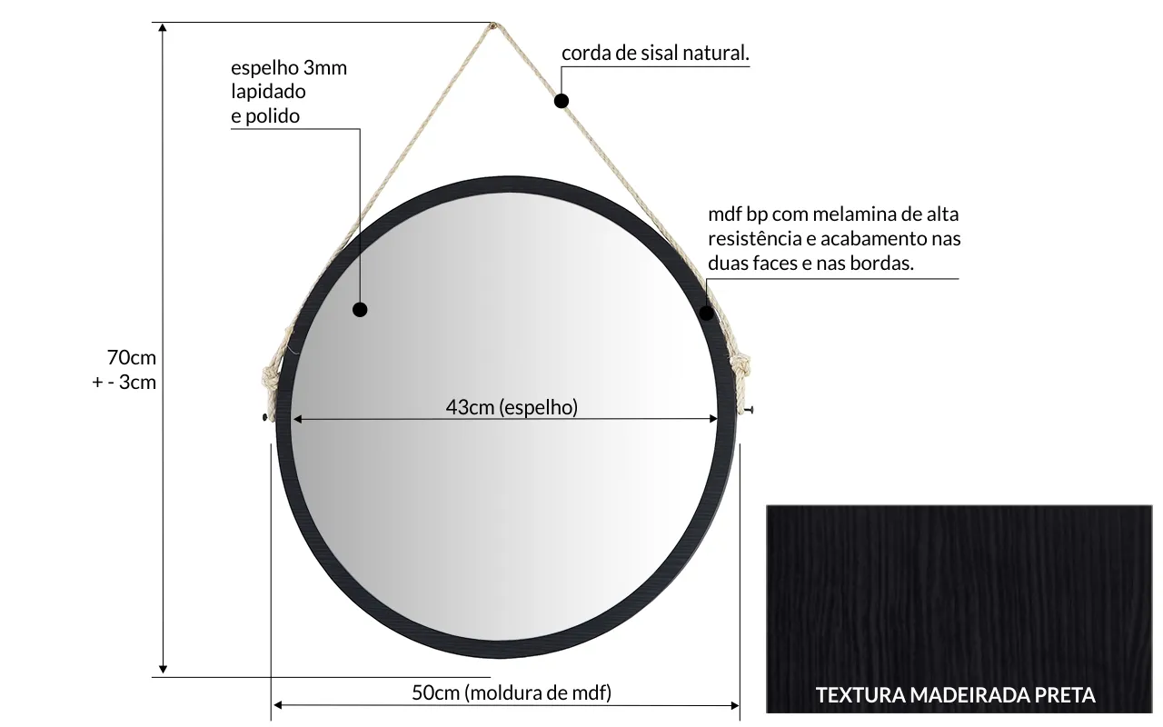 ATENÇÃO: ESTE ESPELHO REDONDO POSSUI DIÂMETRO DE 50 CM.
