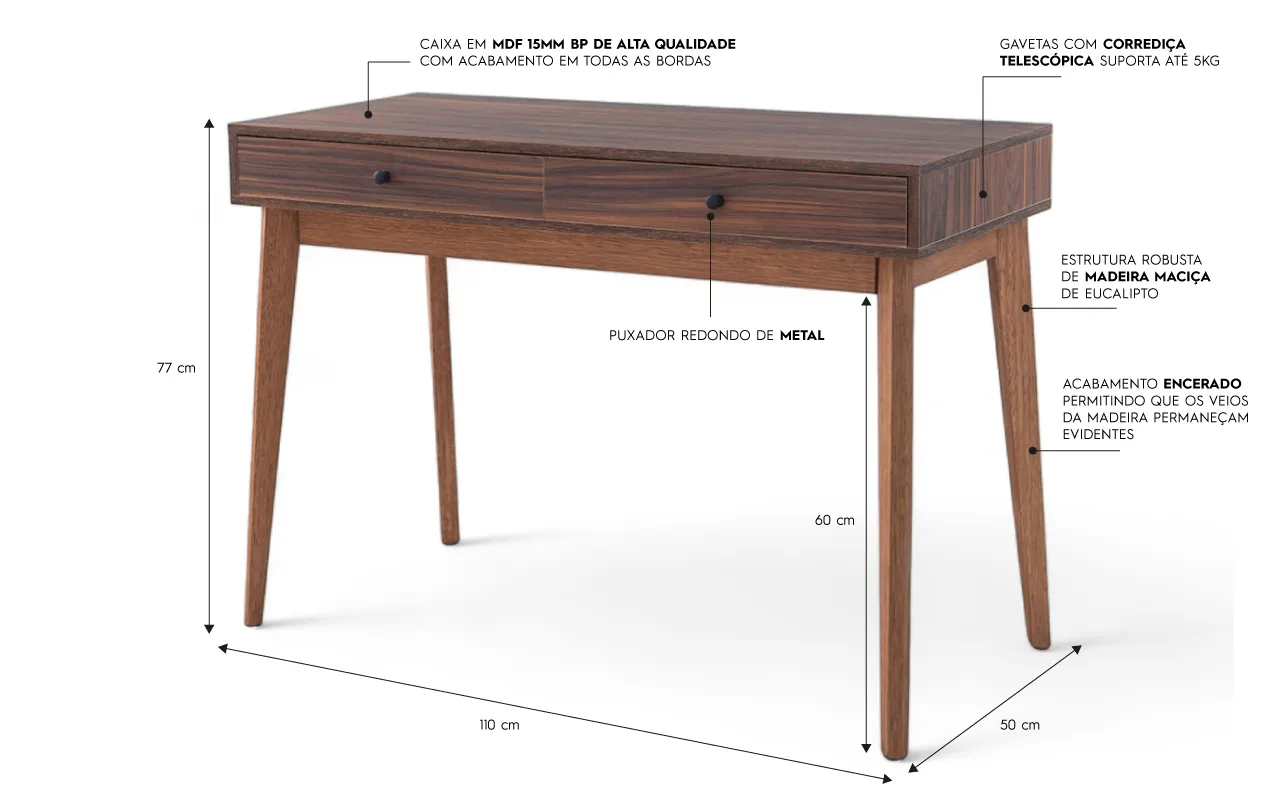 Essa escrivaninha com gavetas com certeza também ficará muito bem como penteadeira para quarto, ou onde preferir, já que o seu design bastante atemporal se encaixa em infinitas decorações e ambientes.