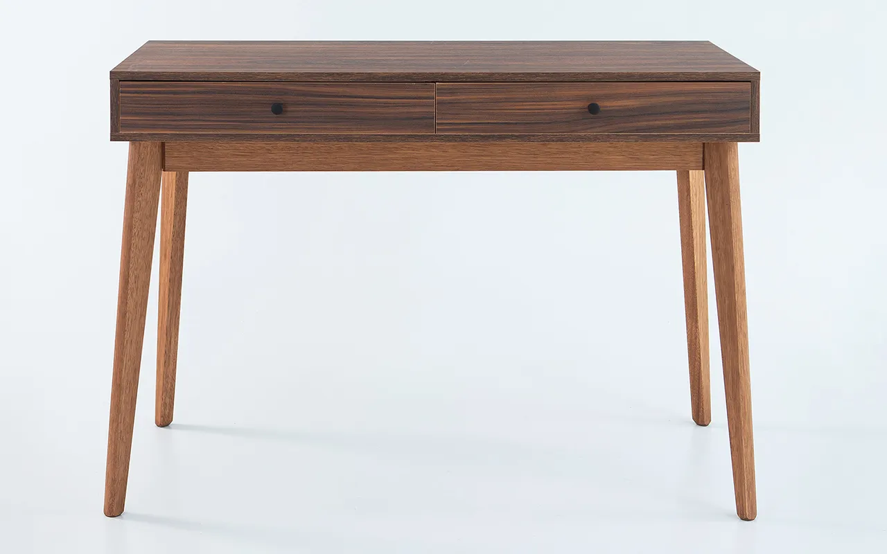 Os pés desta mesa escrivaninha são de madeira maciça, com ótimo acabamento em óleo impregnante na cor jatobá.