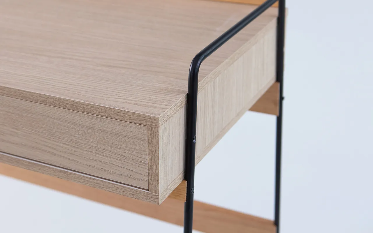 naturais e realça os veios — cada peça é única. Já a caixa das gavetas é feita