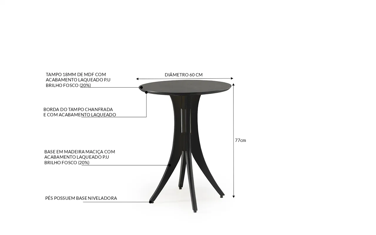 Os pés desta mesa bistrô Juliette são construído em madeira maciça recebe acabamento laqueado P.U com brilho 20%.