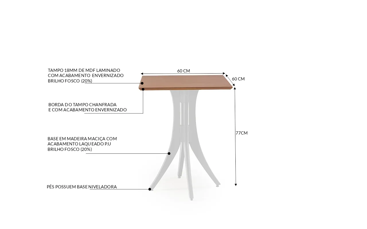 Os pés desta mesa bistrô Juliette são construído em madeira maciça recebe acabamento laqueado P.U com brilho 20%.