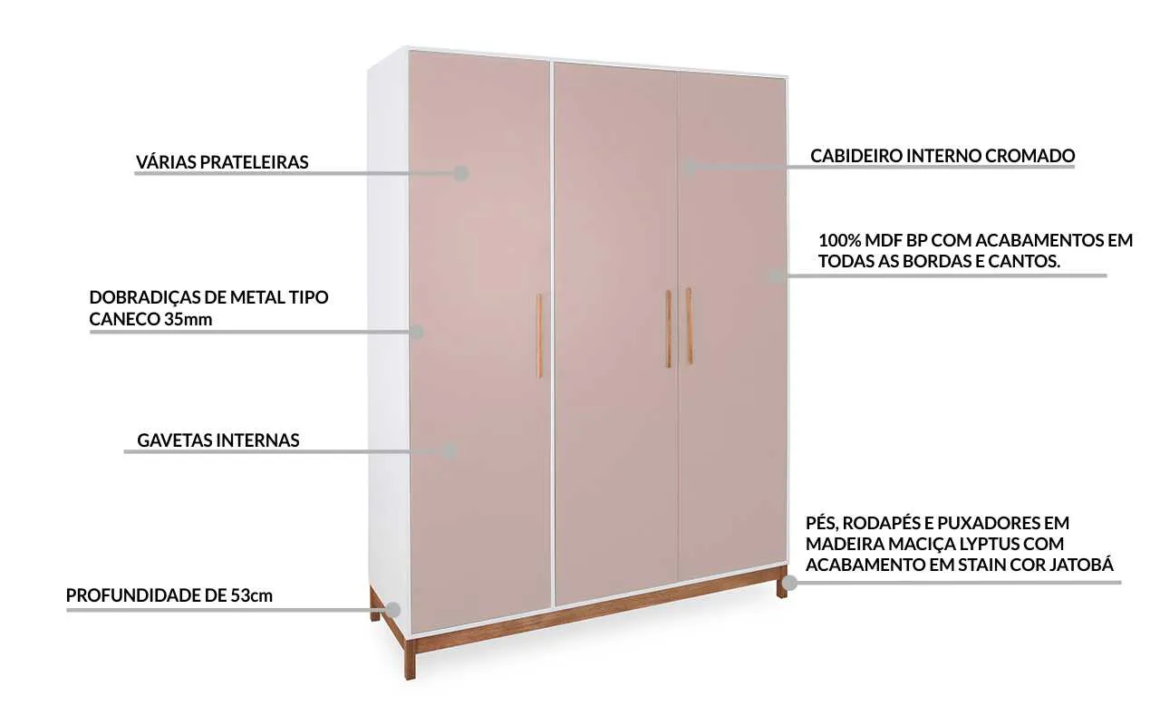 O guarda roupas 3 portas Moore possui estrutura inferior com pés e rodapés 100% em madeira maciça dura de origem legal reflorestada com acabamento a base de stain na tonalidade jatobá. Dessa forma você pode ter fácil acesso à parte inferior do guarda-roupa de madeira para realizar a limpeza do móvel e do quarto. Além disso, a circulação de ar na parte inferior do armário para quarto pequeno evita o mofo e o acúmulo de umidade. Legal né?
