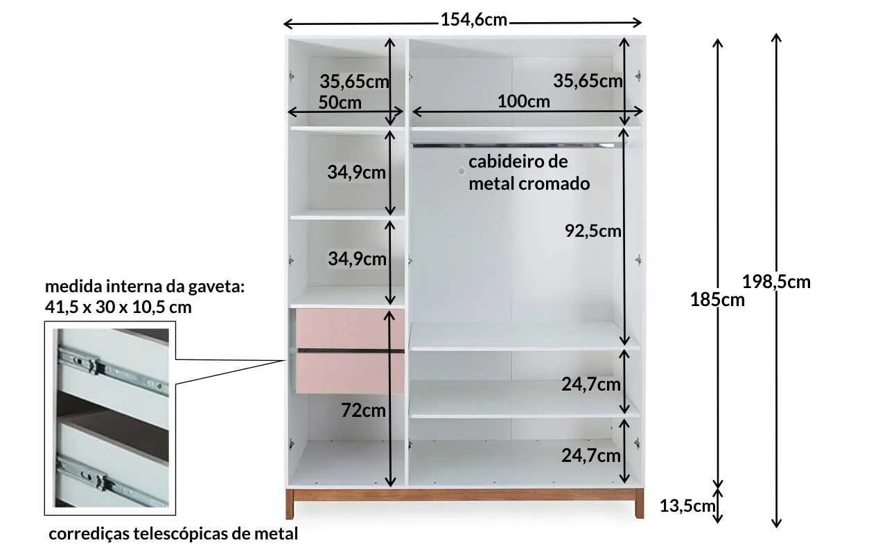 O Roupeiro 3 portas Moore foi cuidadosamente pensado para ser útil, além de bonito! A parte interna deste guarda-roupa mdf possui 8 (oito) compartimentos com prateleiras para você guardar suas roupas. Em cada prateleira você consegue guardar de forma superorganizada duas pilhas de roupas, lado-a-lado. Além disso, ele possui duas gavetas internas (com corrediças telescópicas de metal) e um espaço com cabideiro que aliás, é cromado e superestiloso! As dobradiças das portas são de metal, muito bem-acabadas e muito resistentes.