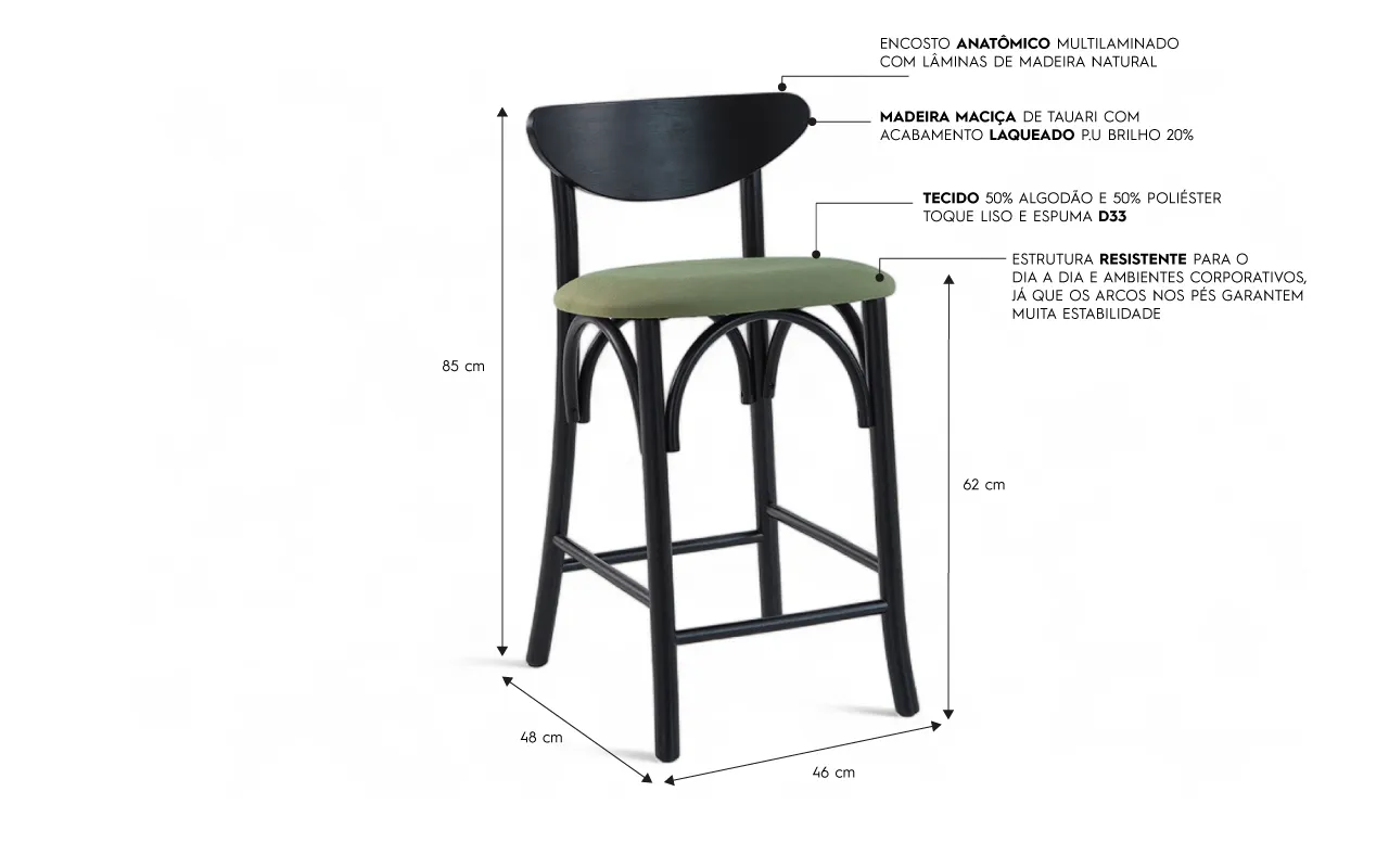 O seu encosto é anatômico, o que traz muito charme e conforto para a banqueta! Ele é construído com lâminas de madeira natural de excelente qualidade.