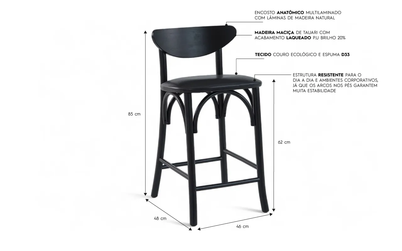 O seu encosto é anatômico, o que traz muito charme e conforto para a banqueta! Ele é construído com lâminas de madeira natural de excelente qualidade.